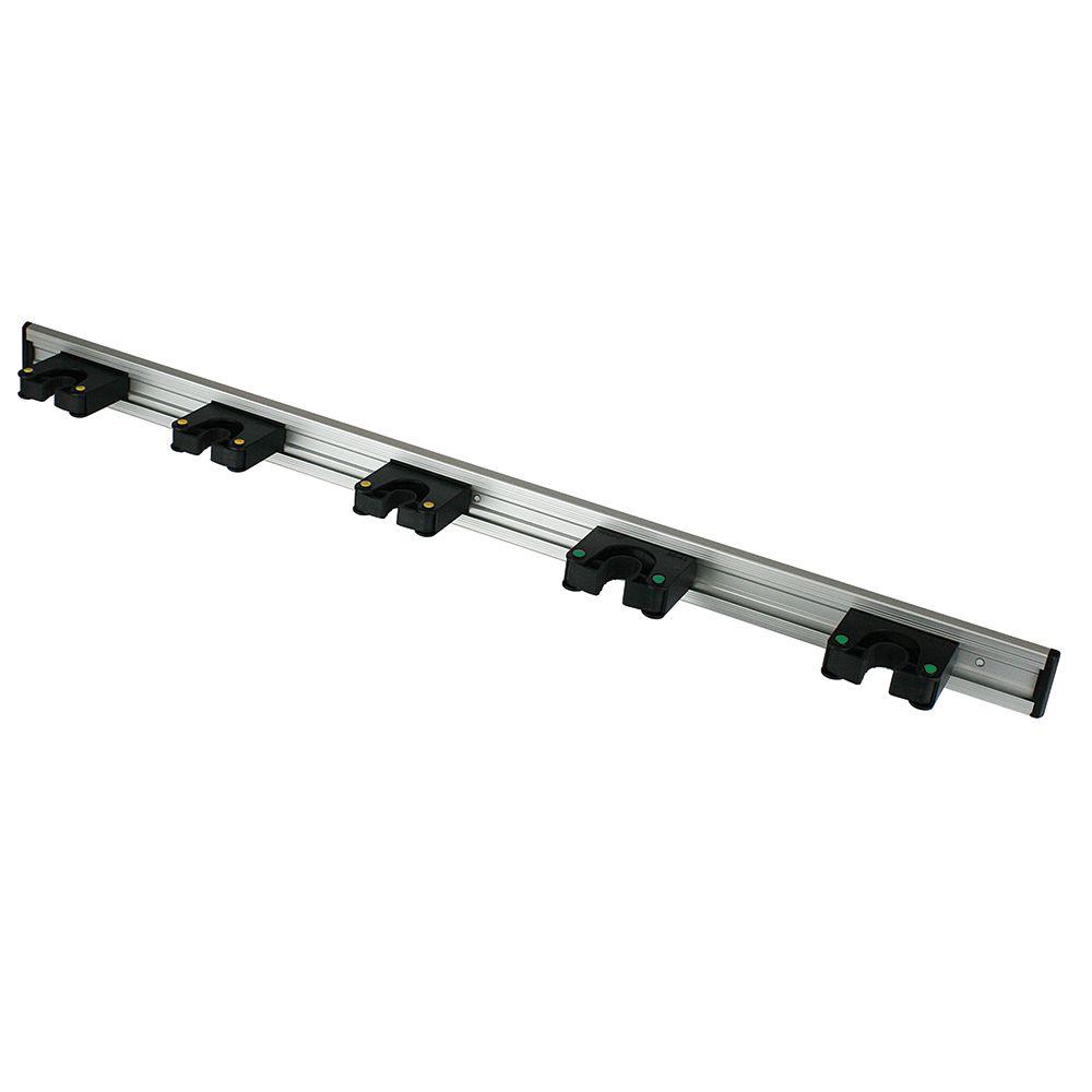 Use the 36 in. Tool bar with 5 rubber grips to organize your tools both in the home and in the garage or shed. The wall mount aluminum rail comes with 5 rubber grip hooks, 3 small and 2 large, to hold a variety of tools. Grips slide around to arrange on the rail as needed. Holds larger and smaller diameter tools like rakes, shovels, mops and similar items. Add on extra storage with accessory small rubber grip and large rubber grip hooks (sold separately). The small grip hooks hold 4.4 lbs while the large ones hold 6.6. lbs. |